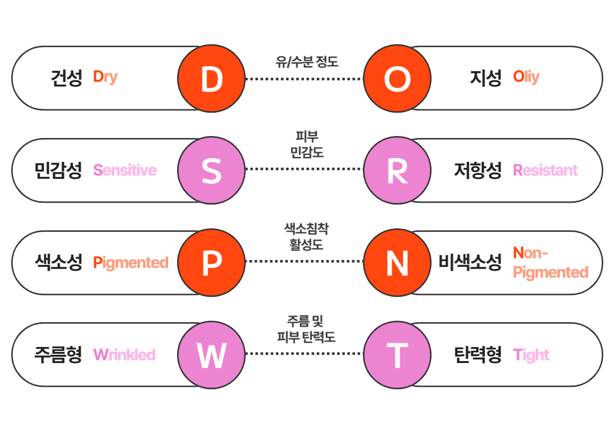 유분/민감도/색소 반응/노화 특성처럼 피부가 반응하는 방식으로 피부 유형을 분류할 수 있어요.